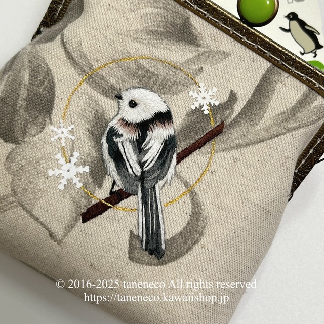 taneneco手刺繍作品『シマエナガさん再来』がま口ポーチ