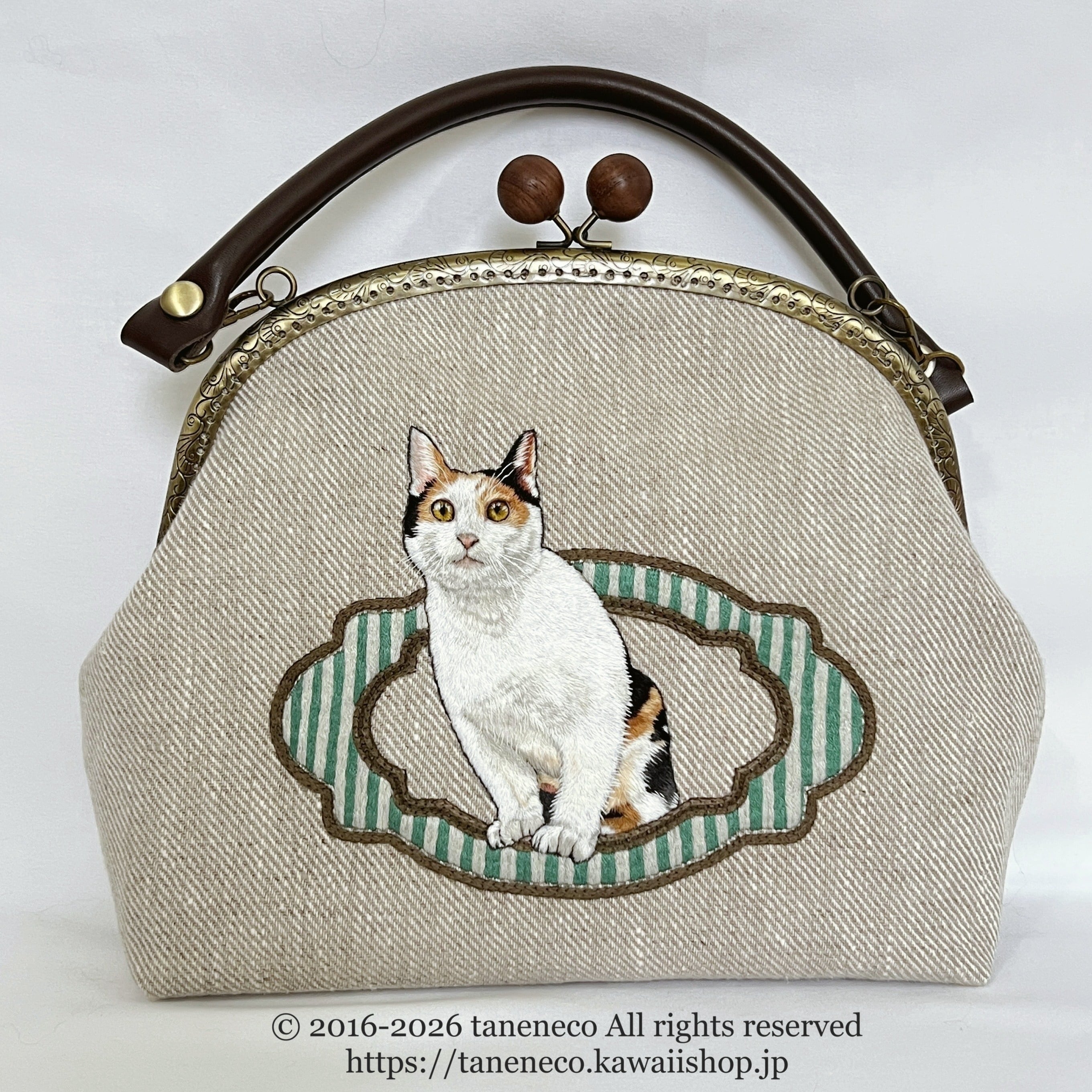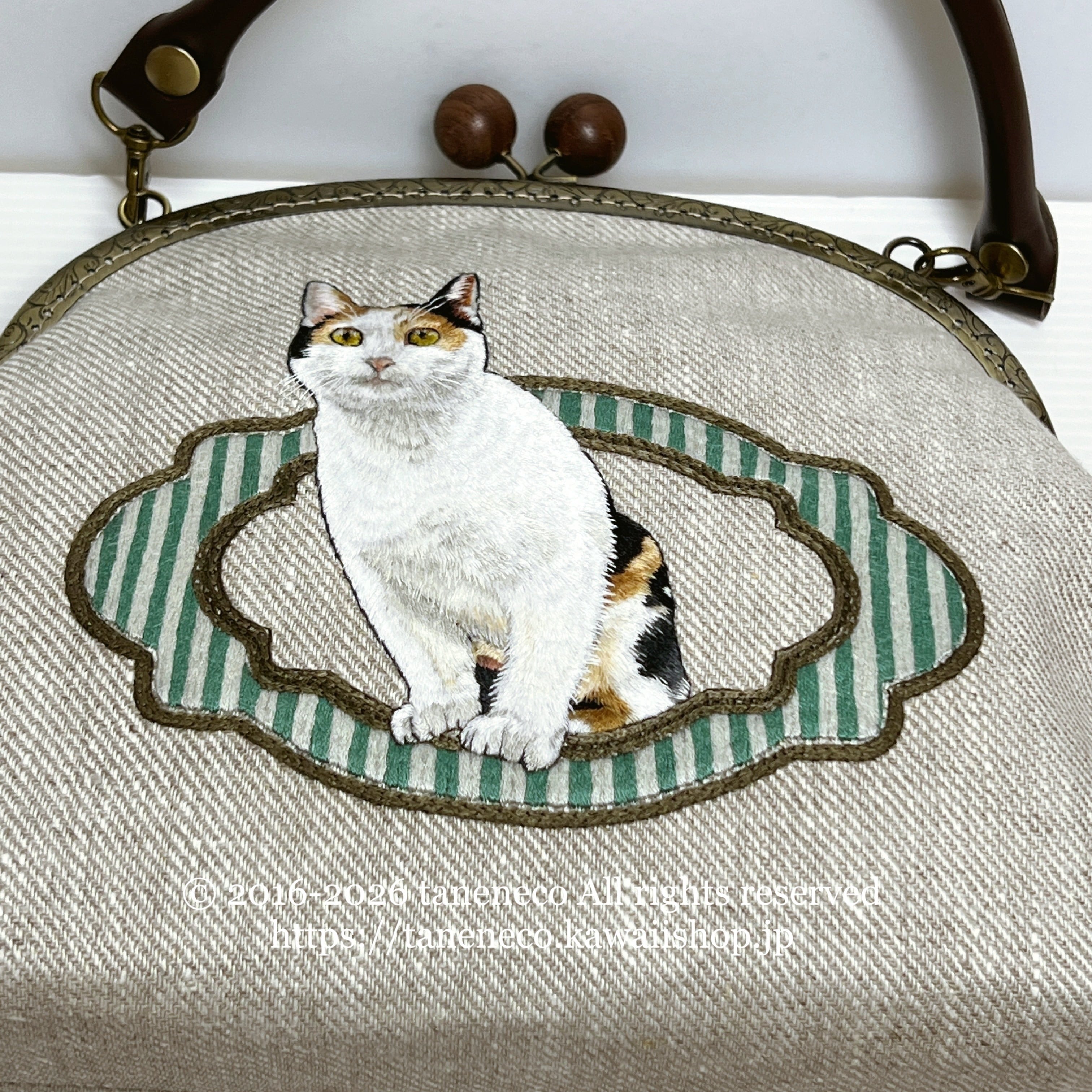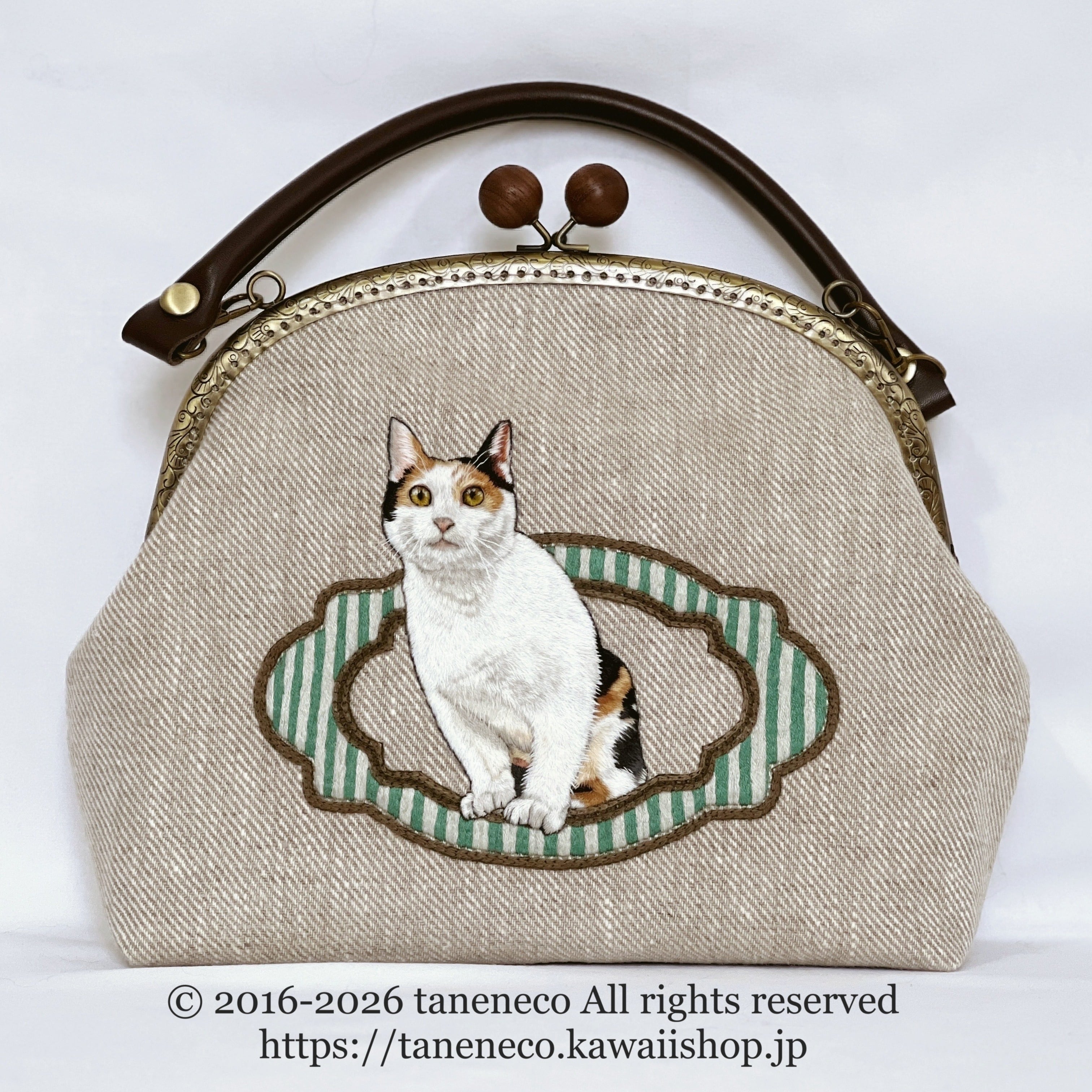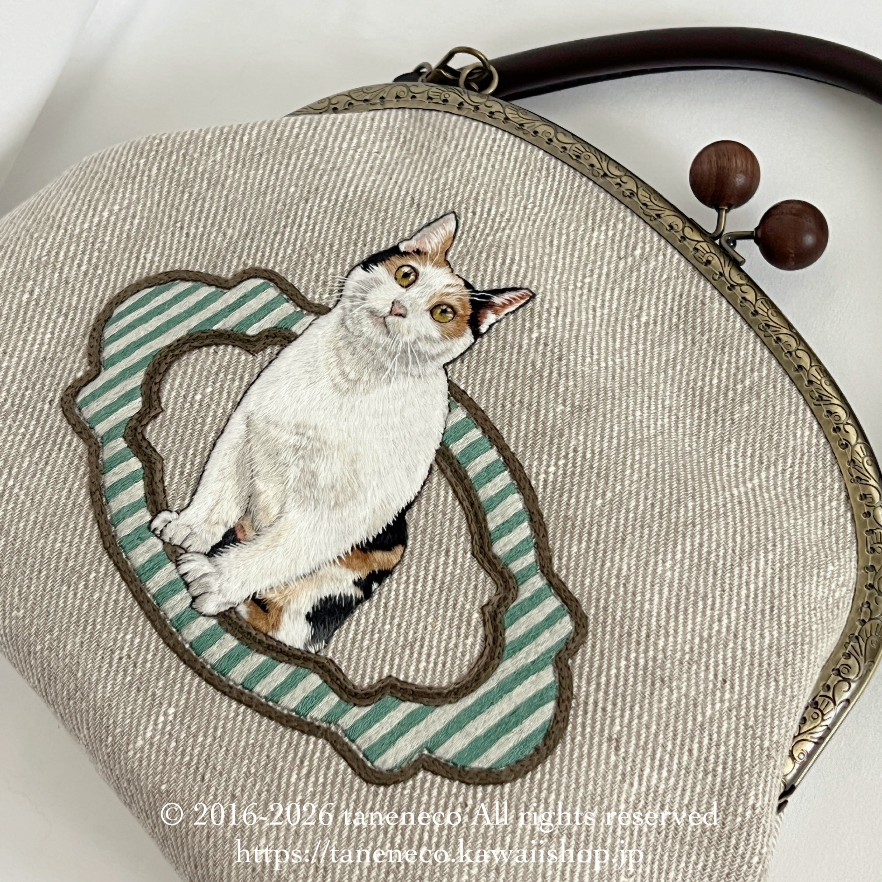 taneneco手刺繍作品「三毛猫が招く 奏福(しあわせ)のさざめき‐The Whispering Fortune of a Calico‐」ハンドバッグ