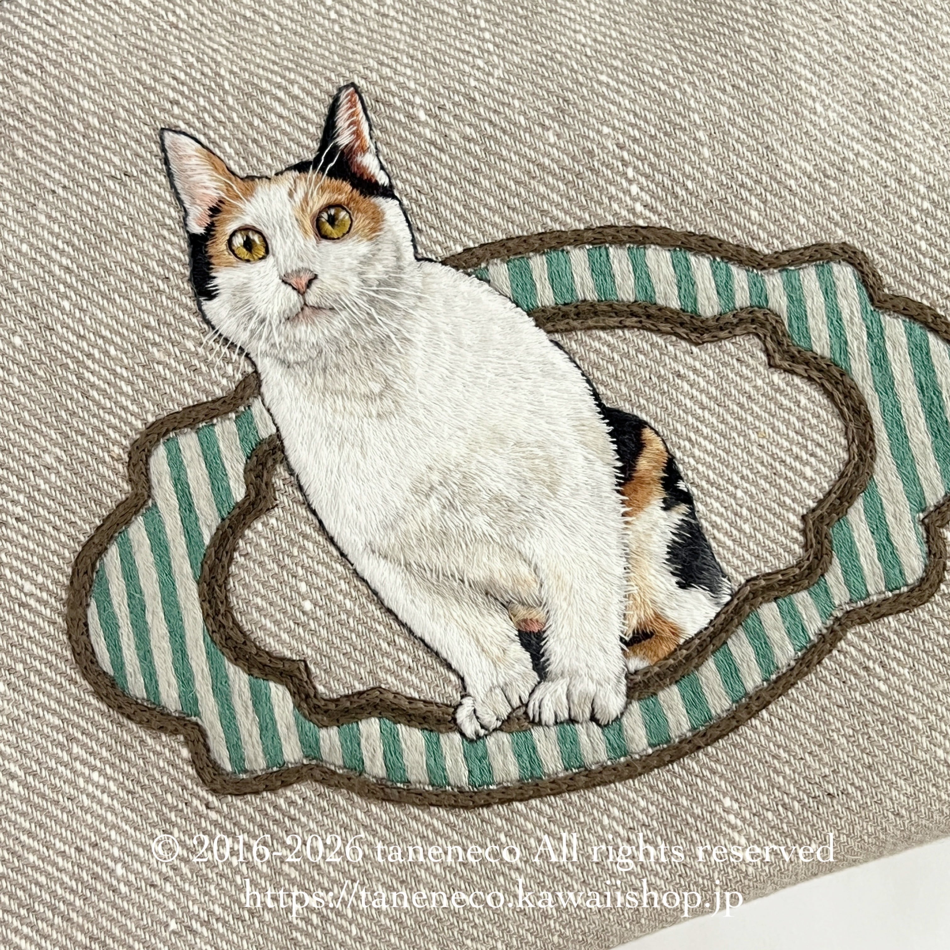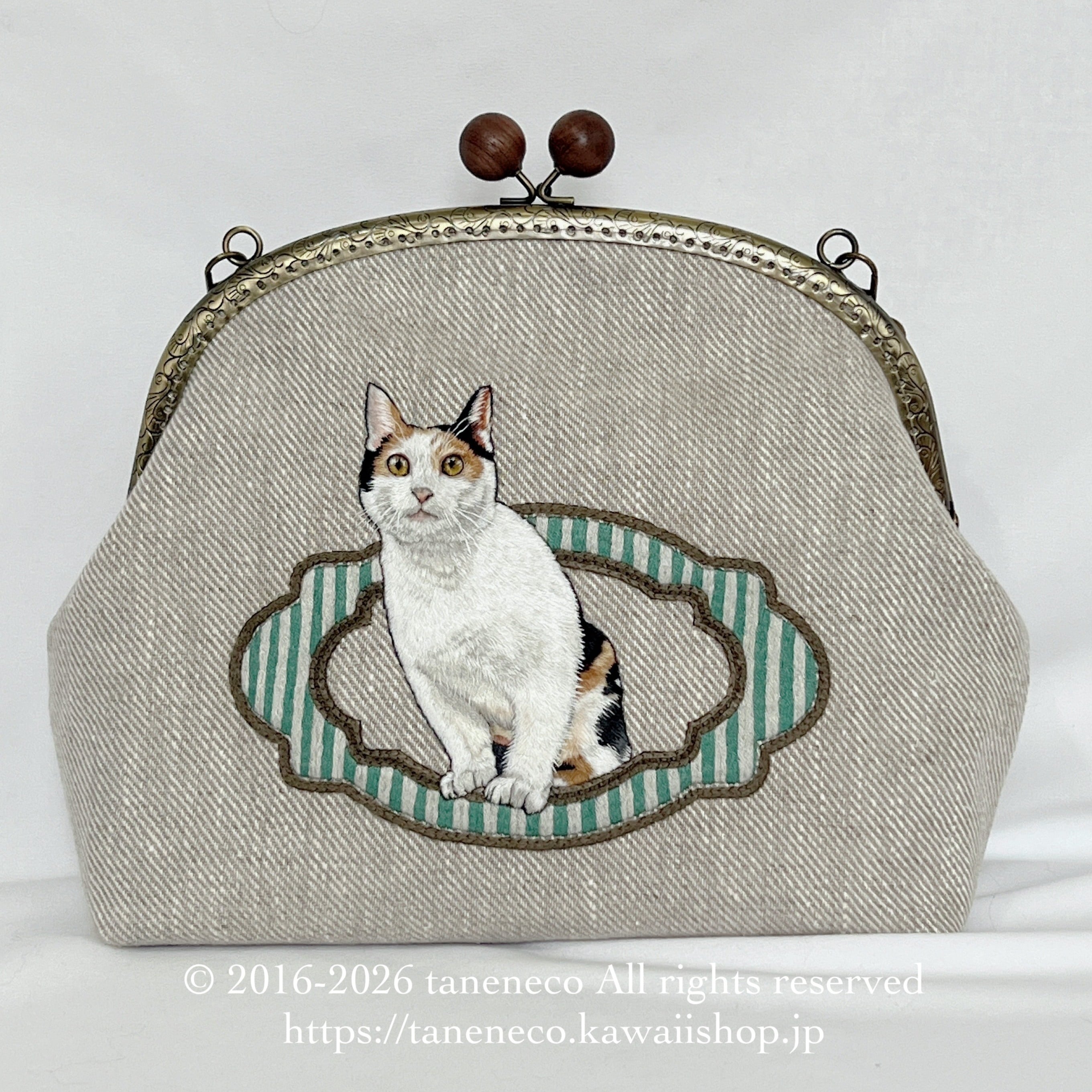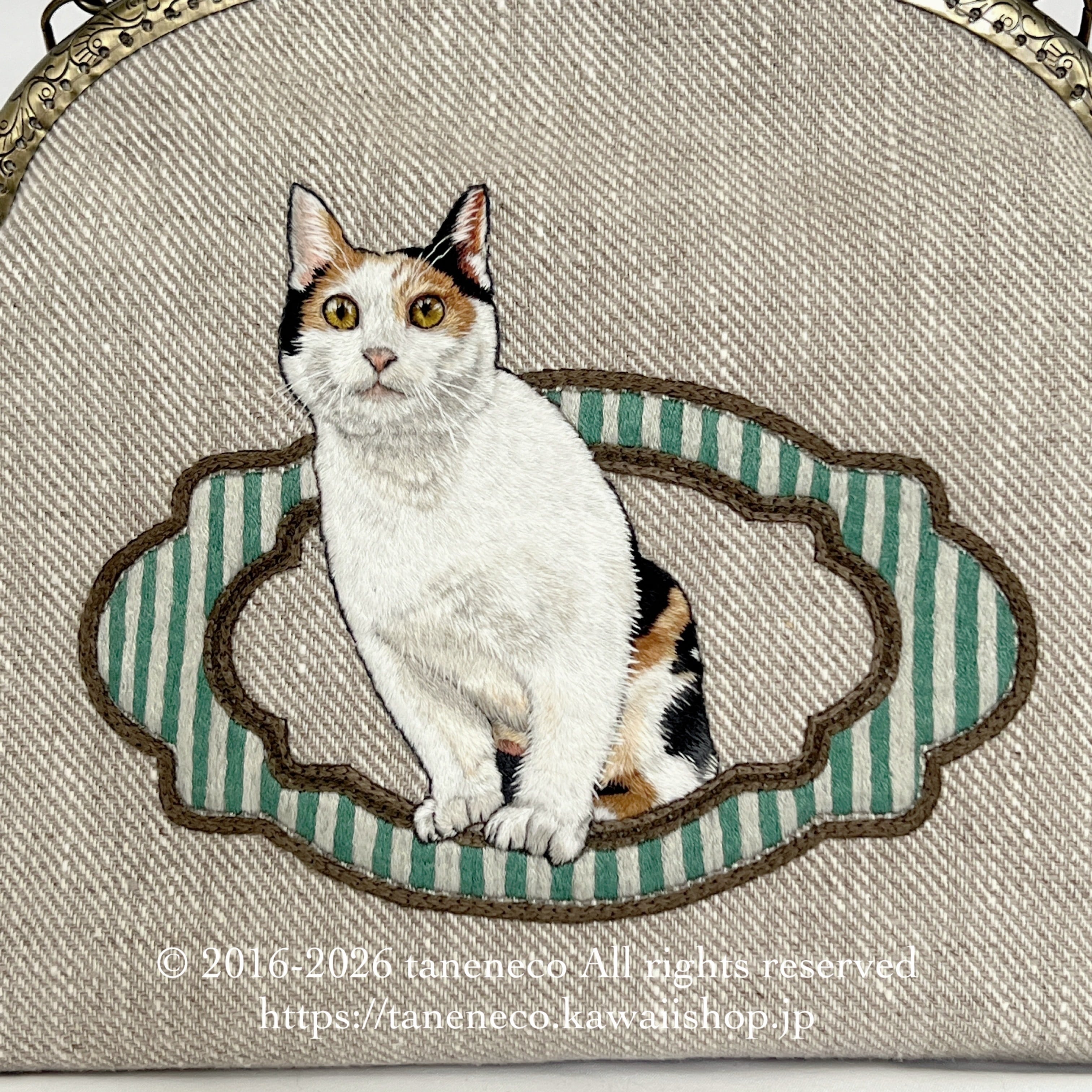 taneneco手刺繍作品「三毛猫が招く 奏福(しあわせ)のさざめき‐The Whispering Fortune of a Calico‐」ハンドバッグ