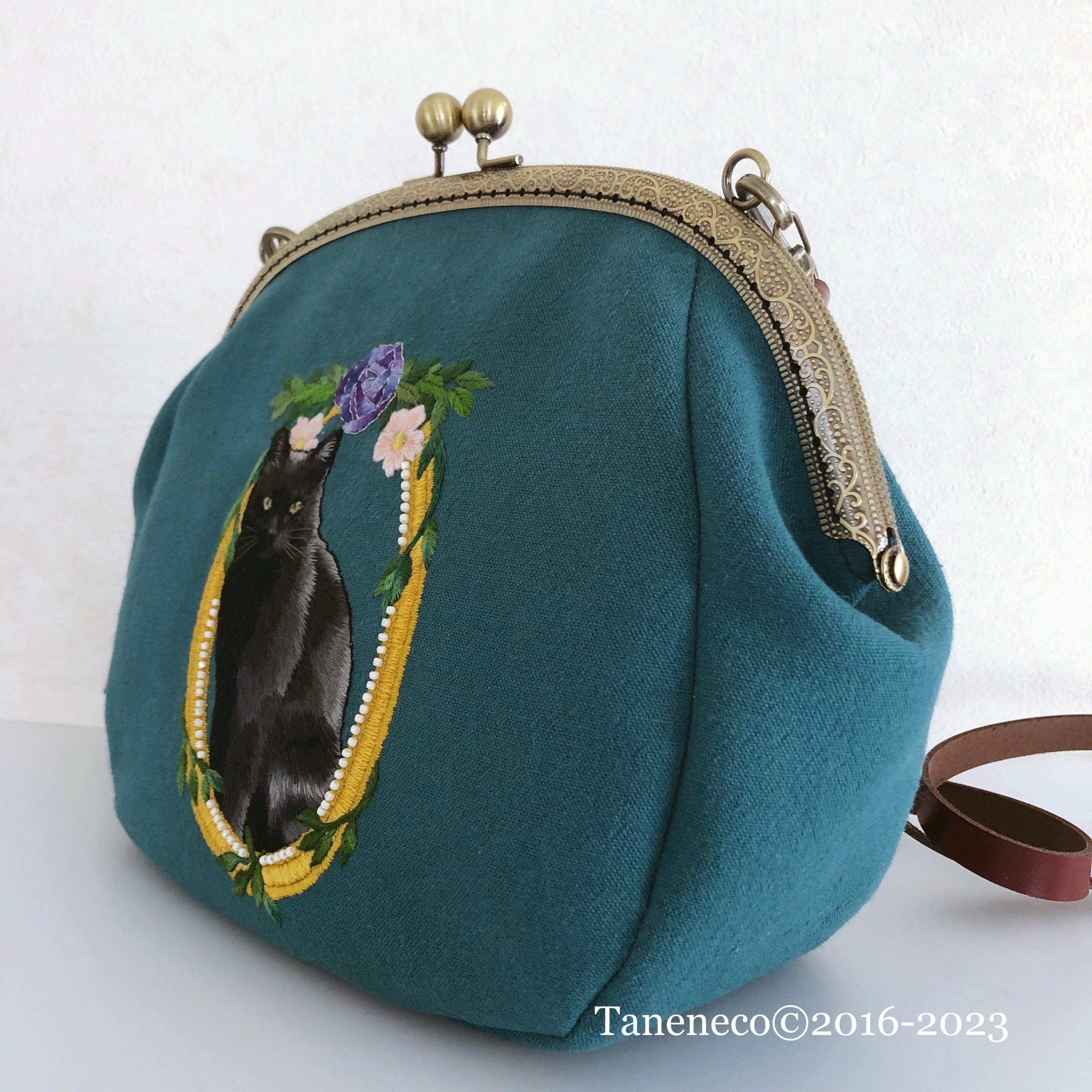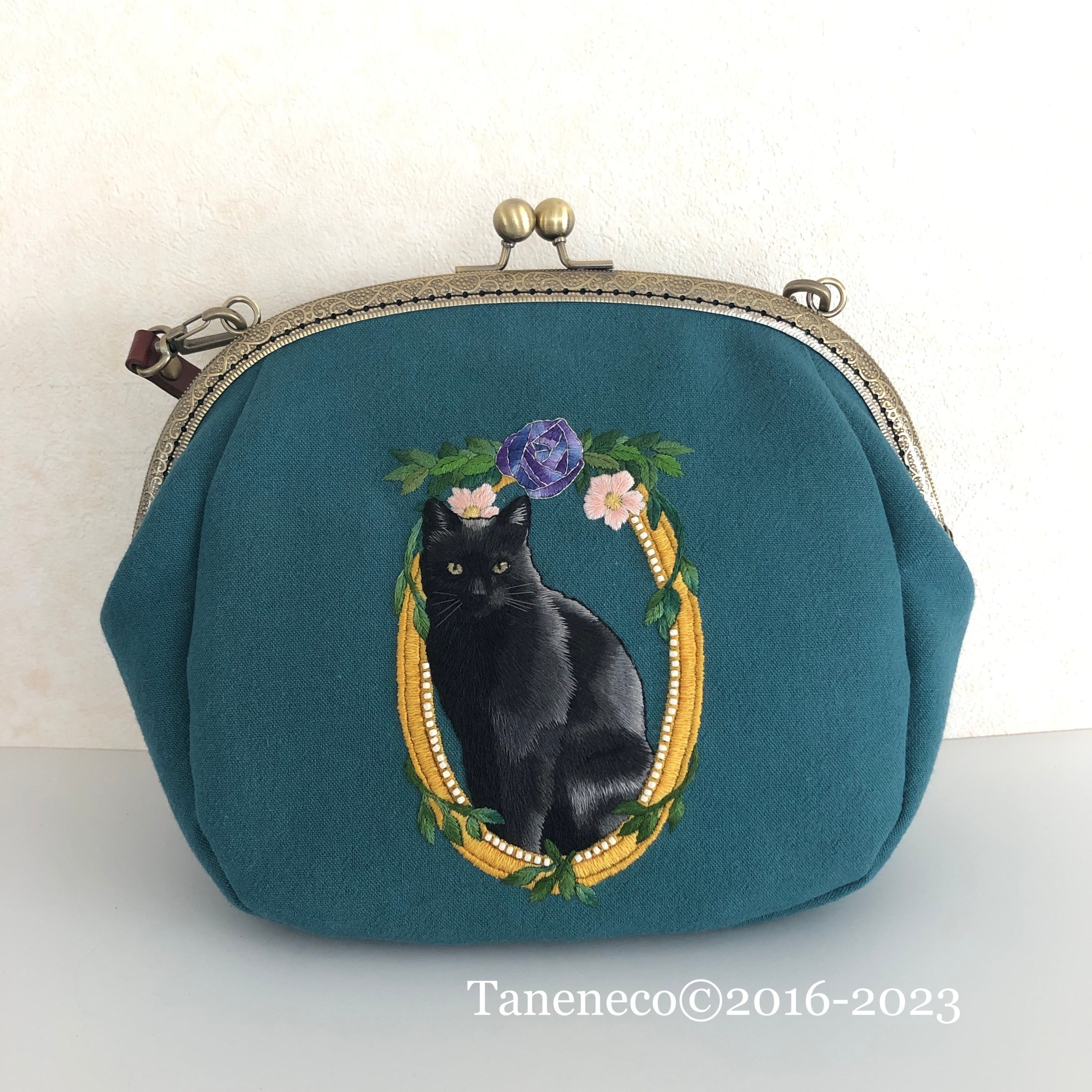 taneneco手刺繍作品『黒猫』がま口ショルダーバッグ