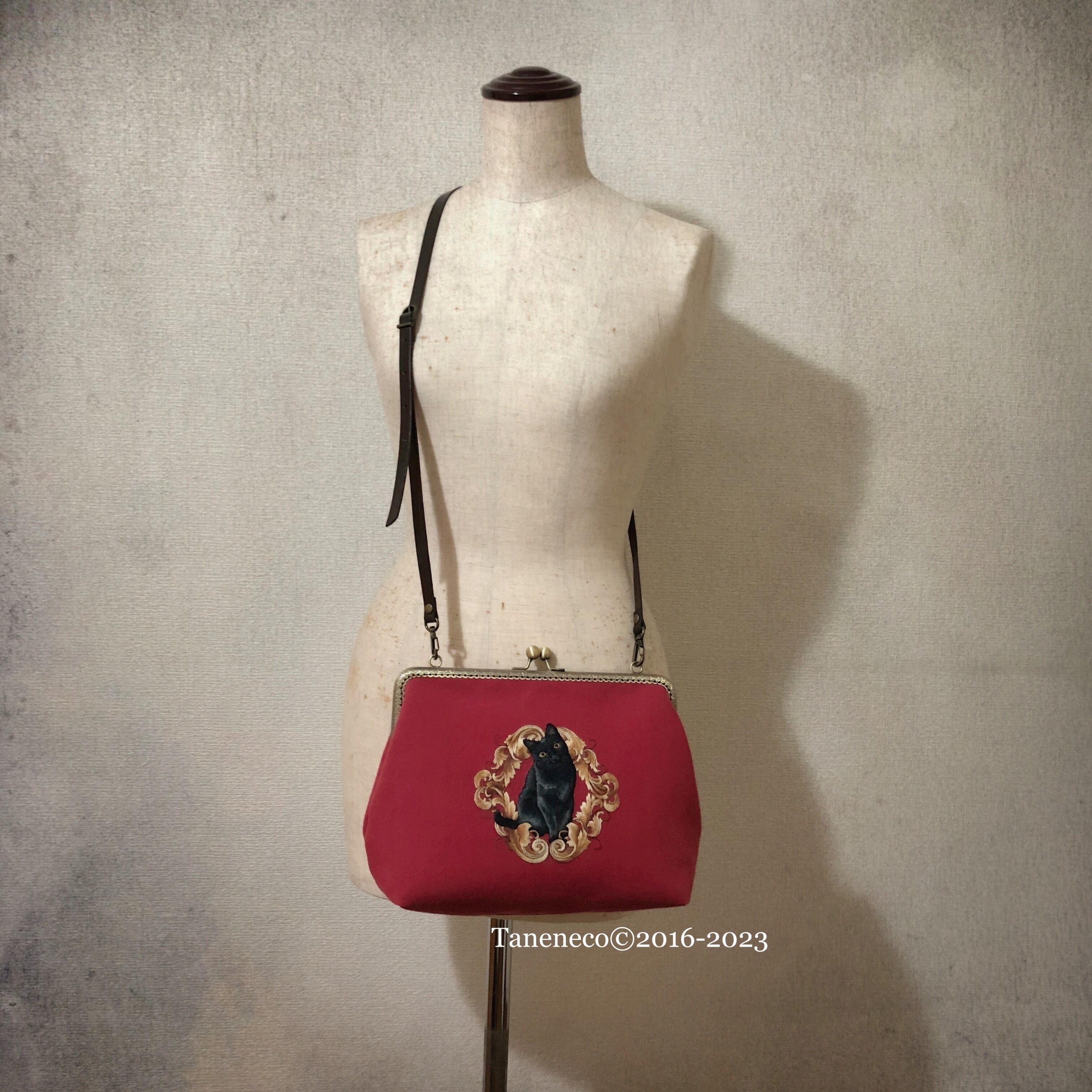 黒猫様の手刺繍が華やかに輝くがま口ショルダーバッグ。tanenecoさんが手掛ける逸品です。ちょうどいい大きさで、外出先での必需品やちょっとしたお出かけに最適です。
